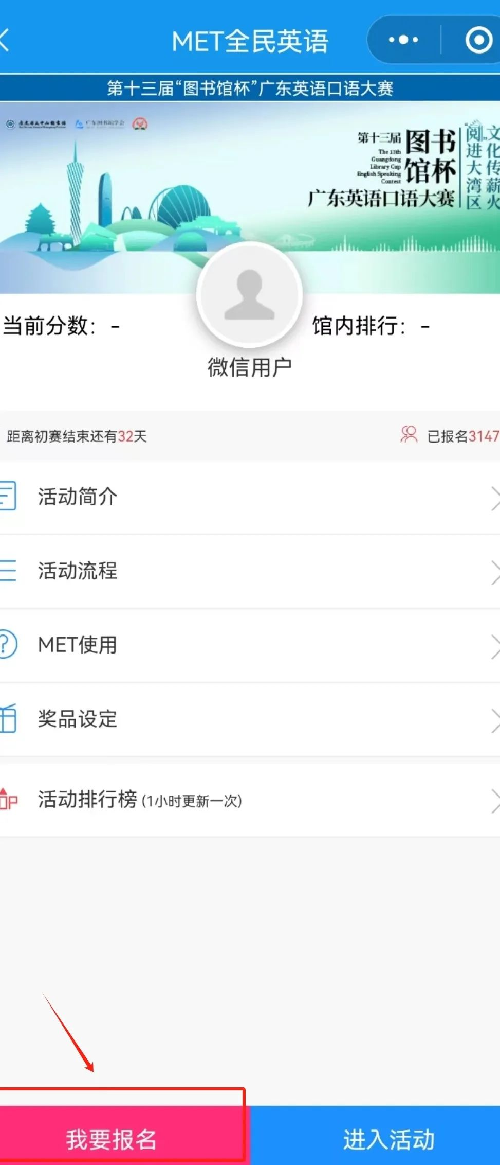 通过“广东英语口语大赛”微信小程序,选择本届大赛进入“选手报名”。