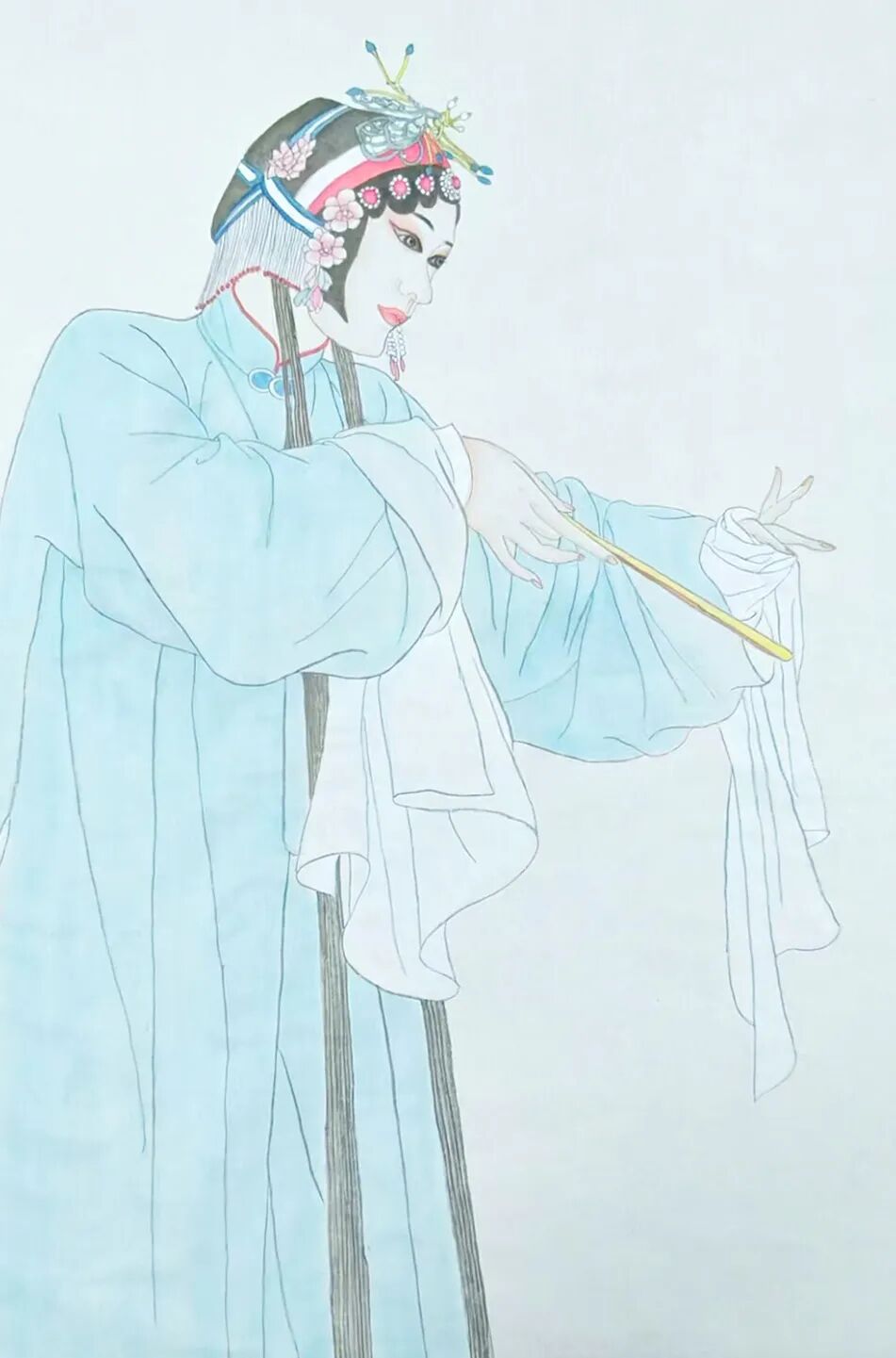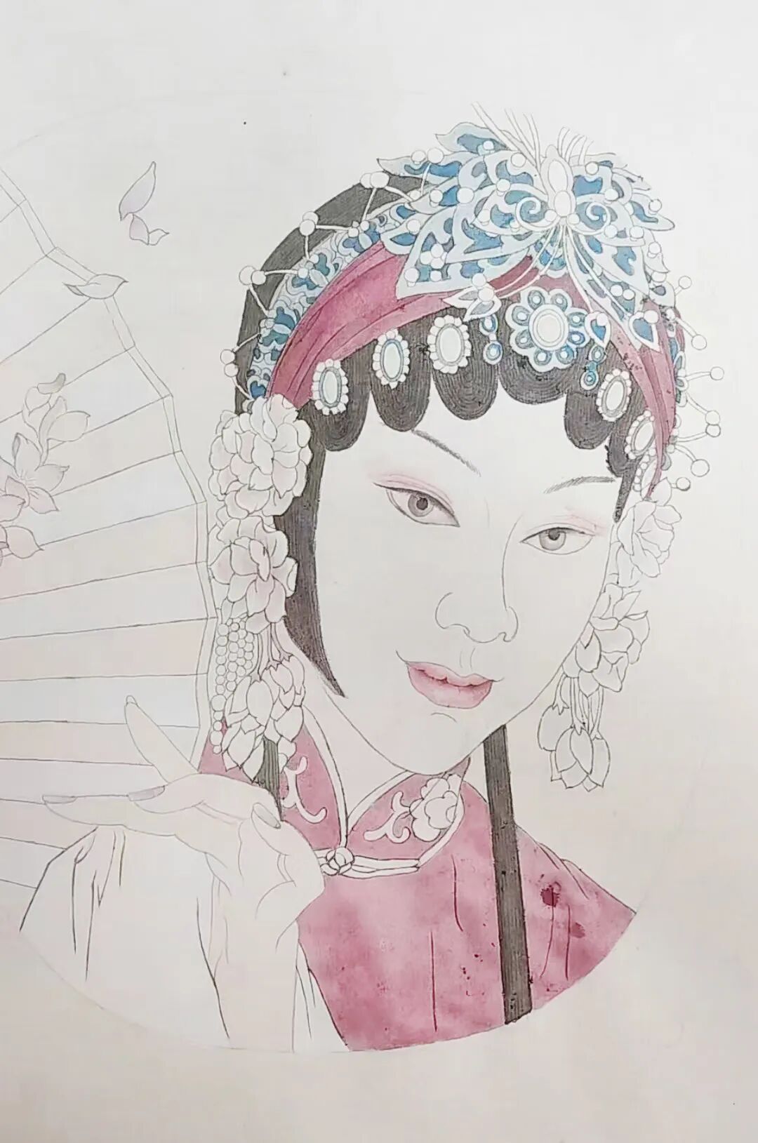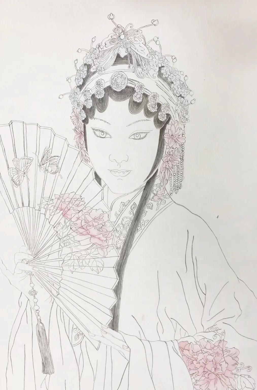 在李老师的悉心辅导下,学生们认真描绘人物的每一处细节,从华丽的头饰到雅致的服装,在这个过程中,逐步掌握工笔人物画的勾线方法与上色技巧,培养了自身的审美情趣和艺术修养,也从中感受到斗门非遗的独特魅力。