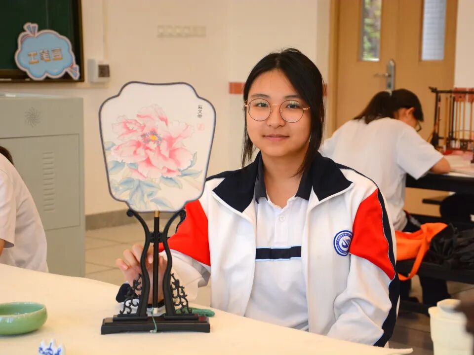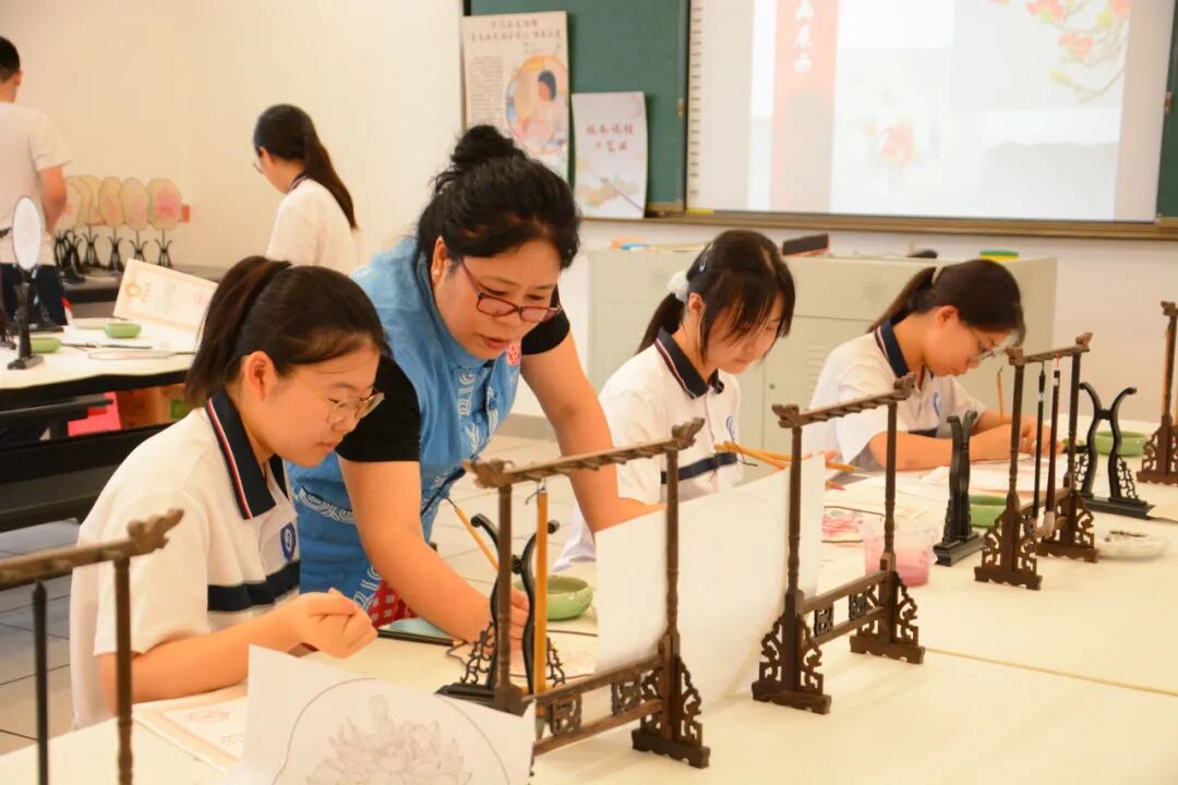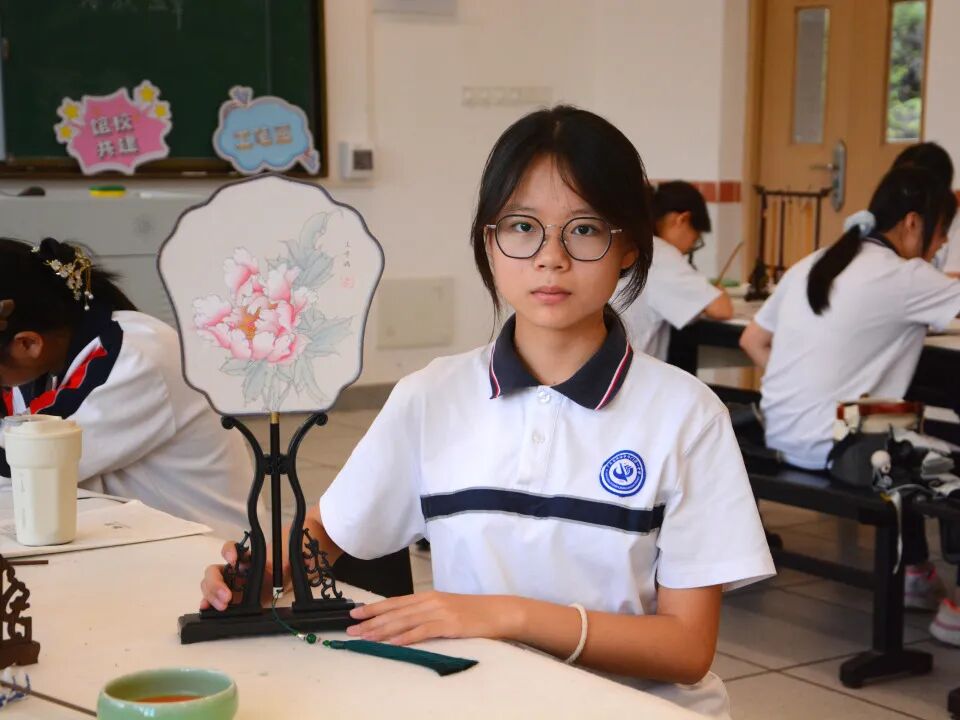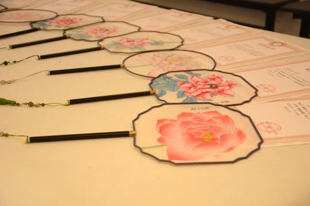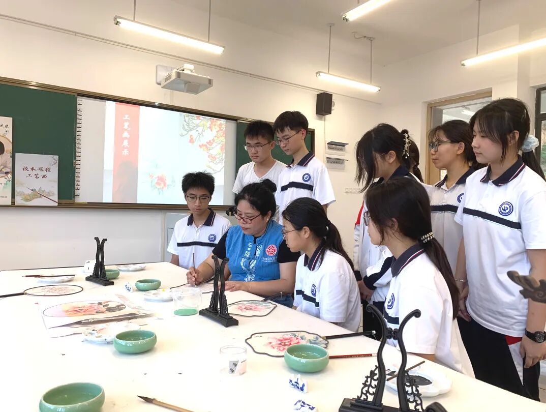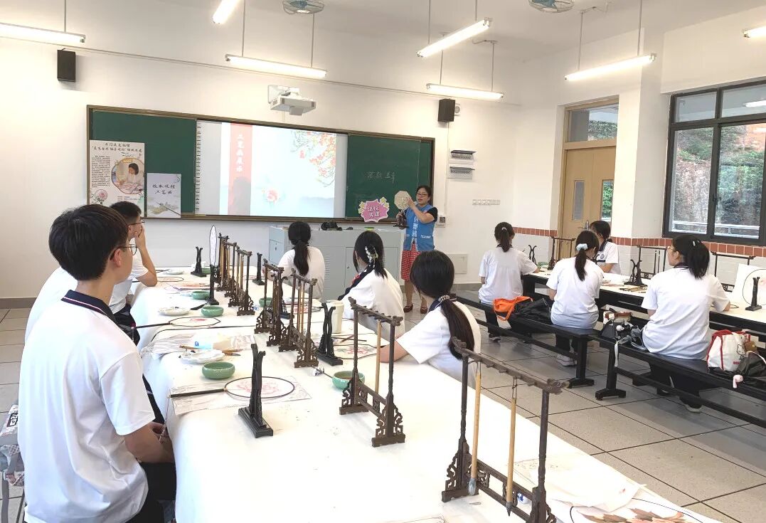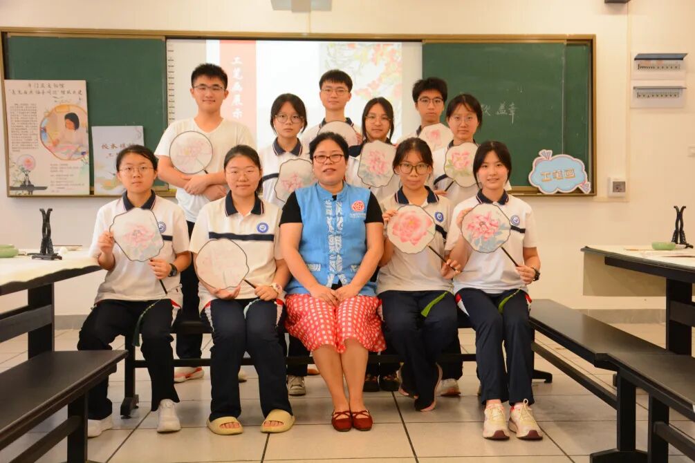 夏风轻抚,荷香浮动。 2025年6月,“美艺与共 协手同行”珠海市斗门区文化馆与珠海市斗门区第一中学“馆校共建”项目——工笔画团扇课在一缕缕墨香中画上了句点。李敏老师在这段充满诗意的艺术旅程中,以其丰富的教学经验引领学生们深入探索了中国传统艺术的瑰宝——工笔画。 工笔团扇,咫尺匠心。 课堂上,李老师俯身细致讲解,从最基础的白描勾勒,到色彩的层层晕染,一笔一画传授工笔神韵;学生们聚精会神,生怕错过任何一个细节。 在李老师的悉心辅导下,学生们屏息凝神,在素绢上缓缓运笔,细致描绘团扇上的花卉。在这过程中,大家不仅习得了工笔画的基本技法,审美意趣与艺术涵养亦如墨韵般悄然沉淀。 时光在笔尖流淌,短短数周的浸润,竟催开了朵朵艺术之花。一幅幅凝聚着巧思与专注的工笔团扇作品次第呈现,素雅的扇面上,花卉或含苞待放,或嫣然盛放,于方寸间尽显工笔画的精工雅致与盎然生机。 课程尾声,李老师给学生递上结课证书,随后,师生们合影留念,凝固了这段与工笔画相伴的珍贵时光。 团扇轻摇,古韵新生。 始于2023年的“美艺与共 协手同行”珠海市斗门区文化馆与珠海市斗门区第一中学“馆校共建”项目——工笔画团扇课,如今已走过三年,持续深耕,硕果盈枝。珠海市斗门区文化馆将优质文化资源精准对接校园美育需求,为斗门一中深化“双新”改革、落实立德树人注入了鲜活的文化动力。 这不仅是一场技艺的传承,更是以美育人、以文化人的生动实践,助力学子在艺术熏陶中涵养品格、遇见更好的自己。