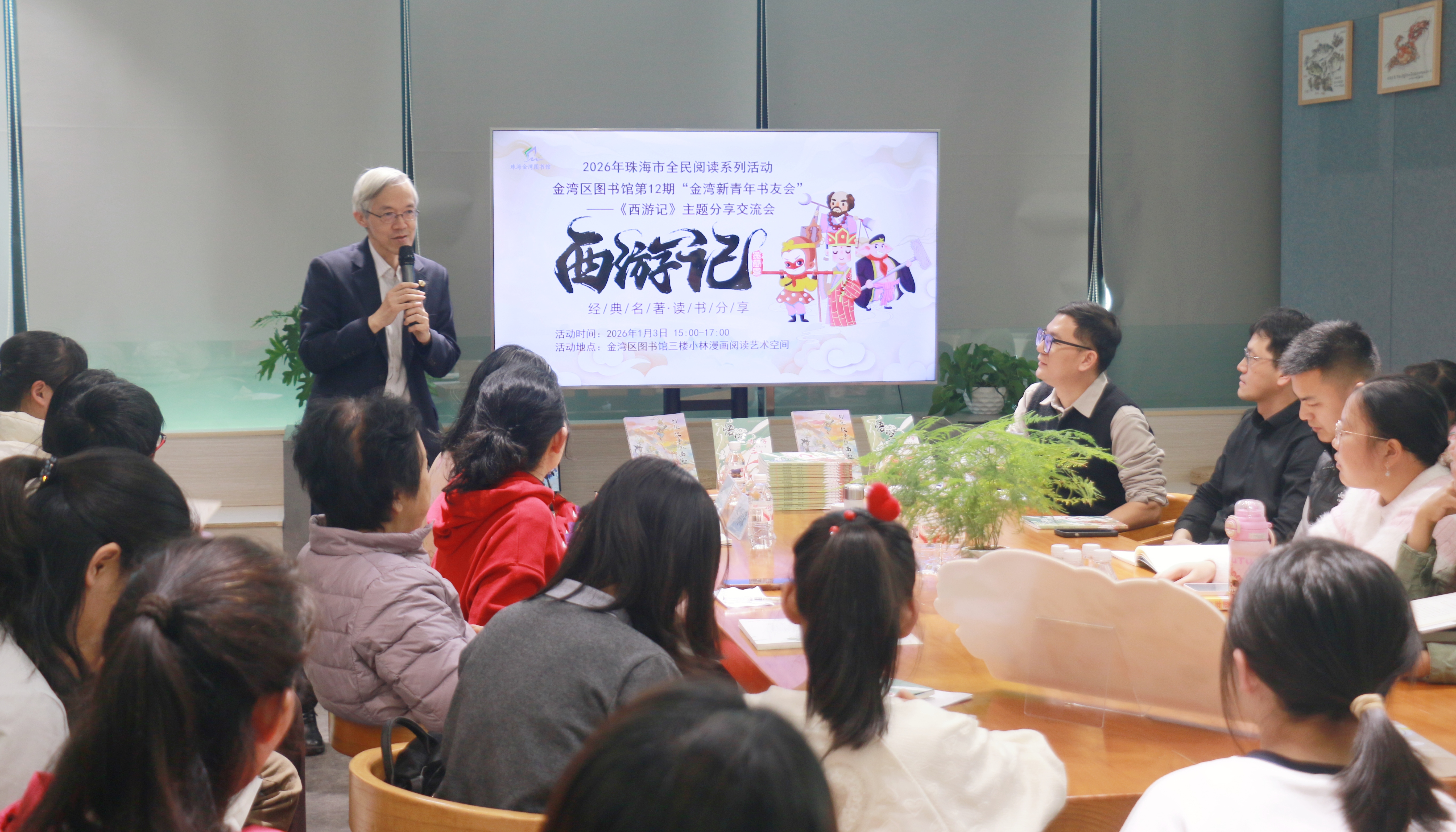 元旦假期,金湾新青年书友会热闹非凡!一场“猴”精彩的《西游记》主题分享交流会在三楼小林漫画阅读艺术空间火热上演!澳门儿童文学作家、《悟空请回答》作者彭执中老师以及香港当代儿童文学作家潘明珠老师、《红楼梦》最新校订版作者李应利老师,带领大家重温经典,畅谈西游。现场气氛热烈,读者们积极参与,共同探寻这部古典名著的时代价值与深层魅力。